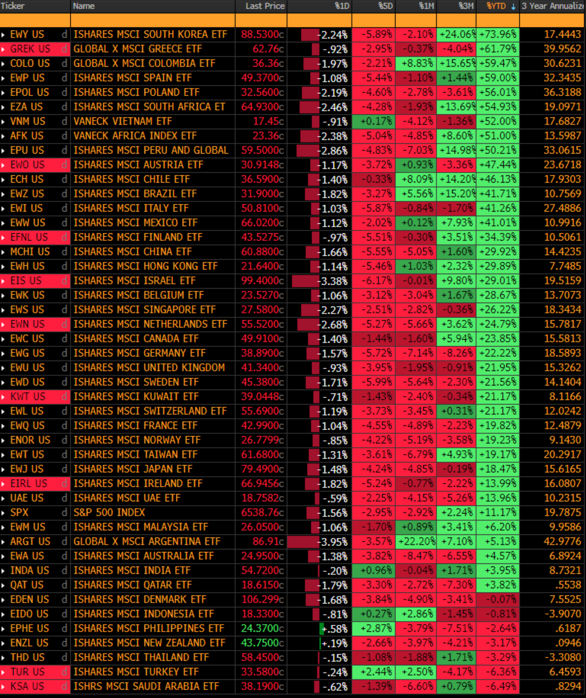 The US is now above a dozen countries. Note that 3 of the 5 countries actually green over the last week come from the 7 that are red YTD. That is one of the reasons I am now in Indonesia. That and ’s recent piece pushed me over the edge! More on that later…